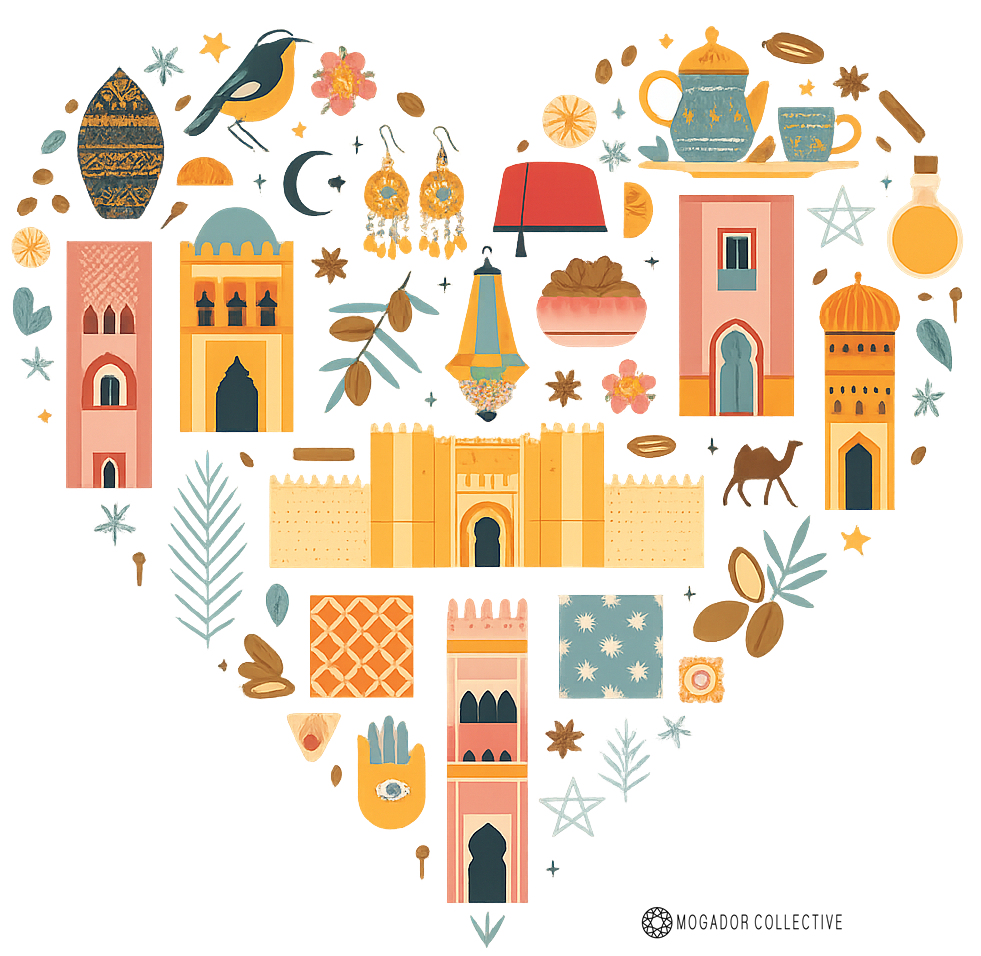 Celebrate the soul of Morocco with this vibrant heart-shaped design, blending iconic symbols from the medina, souks, and desert into one harmonious composition. From the intricate arches and palm leaves to the fez hat and mint tea, every element tells a story of tradition, color, and culture.